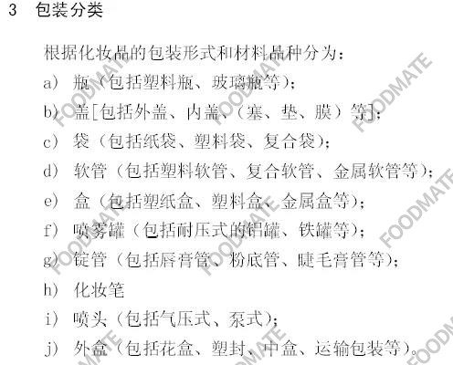 对于瓶、盖、袋、软管、盒、喷雾罐、锭管、化妆笔、喷头、外盒等容器的外观要求参考QB/T 1685-2006《化妆品产品包装外观要求》。其他包装材质的技术要求参考DB37/T 1269-2009《化妆品初级包装通则》。