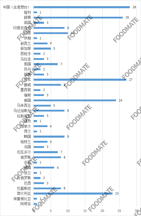 信息显示,未准入境食品的产地有阿根廷、埃塞俄比亚、澳大利亚、巴基斯坦、巴西、白俄罗斯、波兰、德国、多哥、俄罗斯、厄瓜多尔、法国、格陵兰、韩国、荷兰、加拿大、捷克、拉脱维亚、马达加斯加、马来西亚、美国、缅甸、墨西哥、挪威、日本、瑞典、印度、越南等。