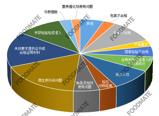 统计显示,食品未准入境的原因主要集中在标签不合格、货证不符、微生物污染问题、未按要求提供证书或合格证明材料、未获检验检疫准入这几个方面。另外,还有部分食品检出包装不合格、产品霉变、感官检验不合格、含有未获检疫准入的动物源成分、检出动物疫病、食品添加剂使用问题、污秽腐败、营养强化剂使用等问题。