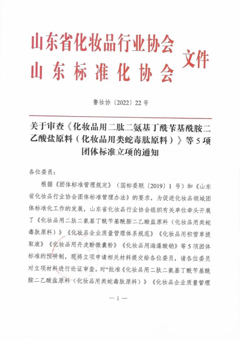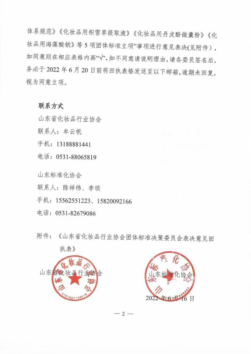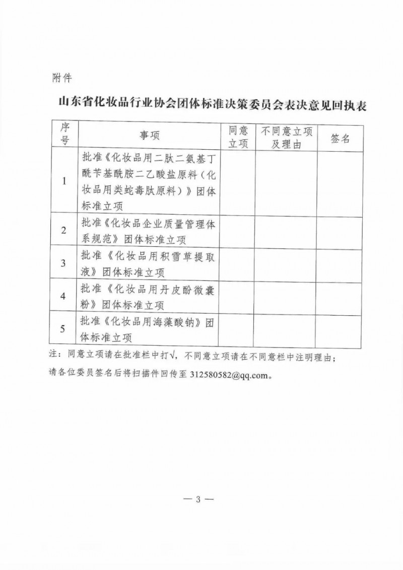 根据《团体标准管理规定》(国标委联〔2019〕1号)和《山东省化妆品行业协会团体标准管理办法》的要求,为促进化妆品领域团体标准化工作的发展,山东省化妆品行业协会组织有关单位牵头开展了《化妆品用二肽二氨基丁酰苄基酰胺二乙酸盐原料(化妆品用类蛇毒肽原料)》《化妆品企业质量管理体系规范》《化妆品用积雪草提取液》《化妆品用丹皮酚微囊粉》《化妆品用海藻酸钠》等5项团体标准的预研制,现将立项申请相关材料提交给各位委员,请各位委员对立项材料进行论证审查。对“批准《化妆品用二肽二氨基丁酰苄基酰胺二乙酸盐原料(化妆品用类蛇毒肽原料)》《化妆品企业质量管理体系规范》《化妆品用积雪草提取液》《化妆品用丹皮酚微囊粉》《化妆品用海藻酸钠》等5项团体标准立项”事项进行意见表决(见附件),如同意则在相应表格内画“√”,如不同意请说明理由,请各委员签名后,务必于2022年6月20日前将回执表格发送至以下邮箱,逾期未回复,视为同意立项。
