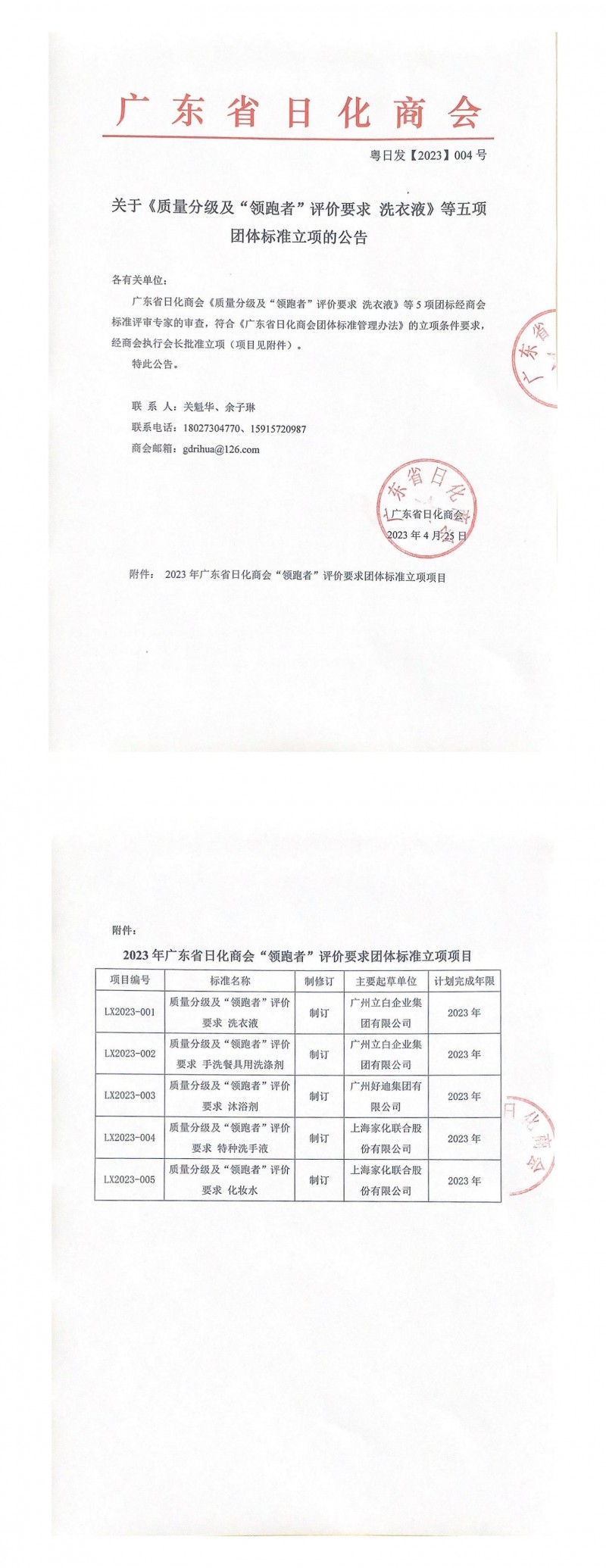 广东省日化商会《质量分级及“领跑者”评价要求 洗衣液》等5项团标经商会标准评审专家的审查,符合《广东省日化商会团体标准管理办法》的立项条件要求,经商会执行会长批准立项(项目见附件)。