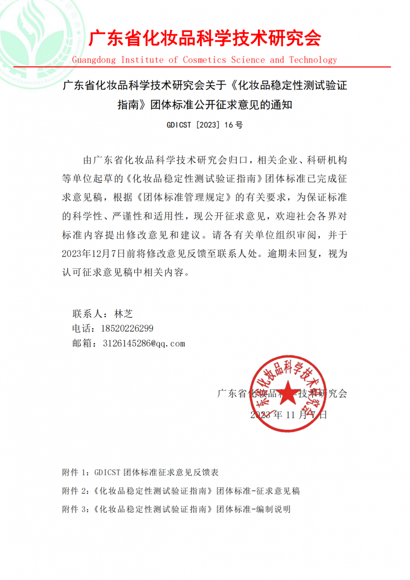 由广东省化妆品科学技术研究会归口,相关企业、技术研究机构等单位起草的《化妆品稳定性测试验证指南》团体标准已完成征求意见稿,根据《团体标准管理规定》的有关要求,为保证标准的科学性、严谨性和适用性,现公开征求意见,欢迎社会各界对标准内容提出修改意见和建议。请各有关单位组织审阅,并于2023年12月7日前将修改意见反馈至联系人处。逾期未回复,视为认可征求意见稿中相关内容。