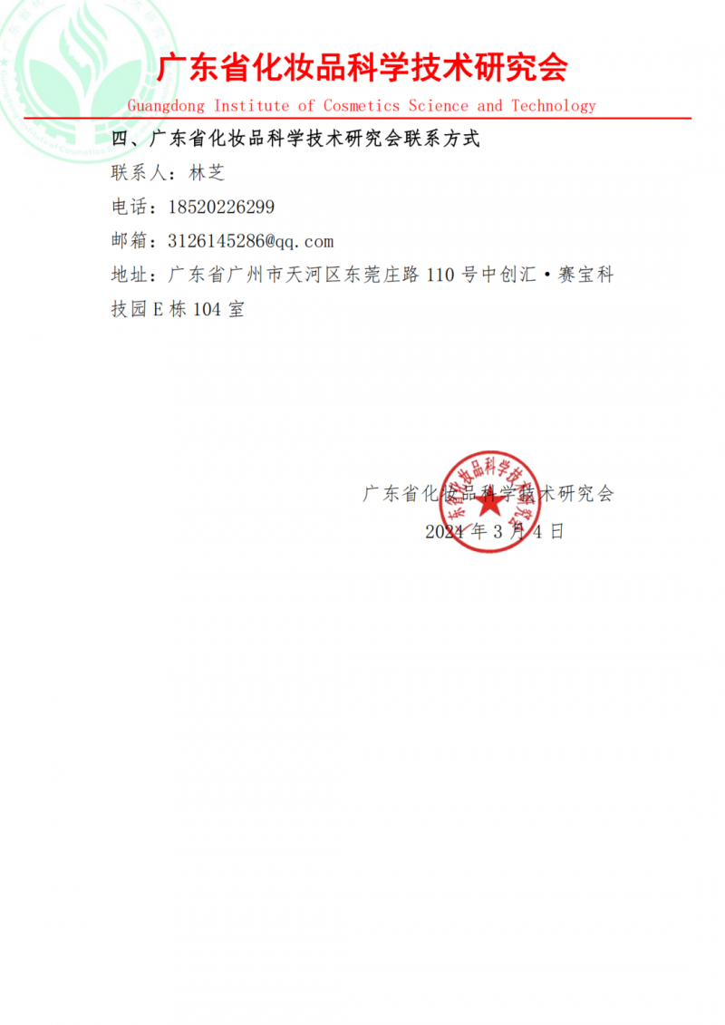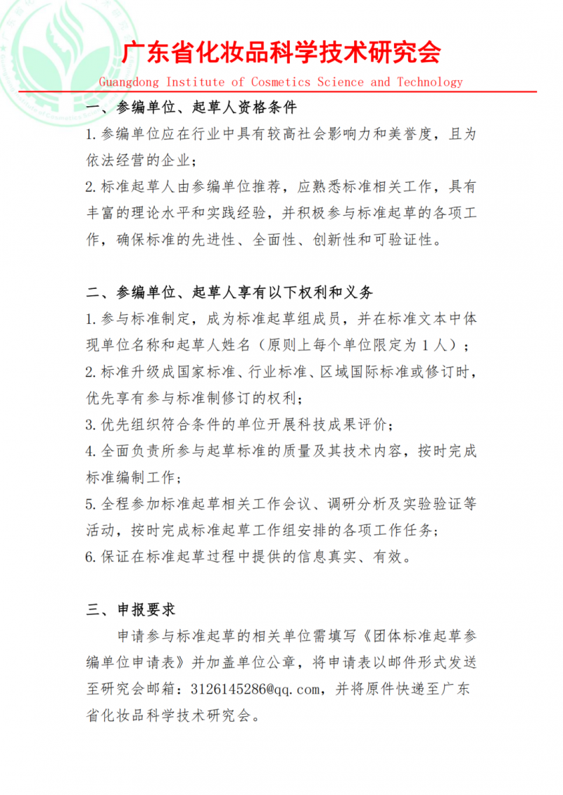 申请参与标准起草的相关单位需填写《团体标准起草参编单位申请表》并加盖单位公章,将申请表以邮件形式发送至研究会邮箱:3126145286@qq.com,并将原件快递至广东省化妆品科学技术研究会。