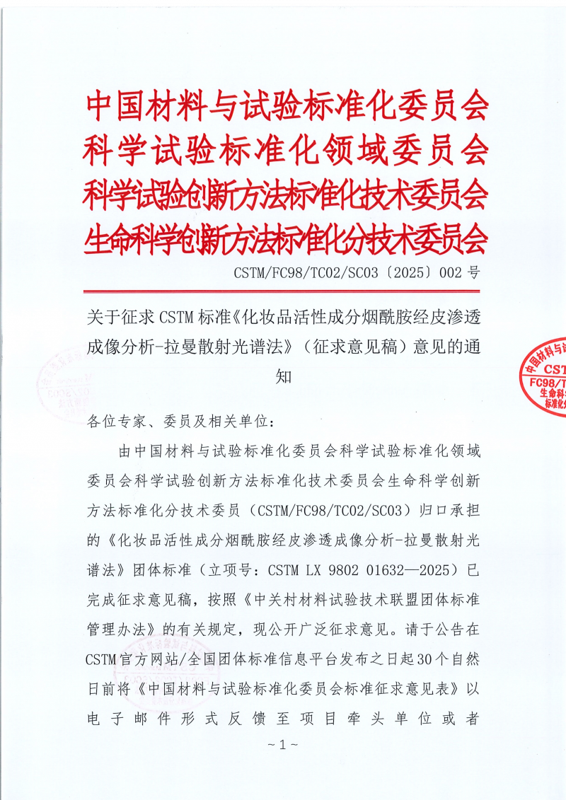 中关村材料试验技术联盟关于CSTM团体标准《 化妆品活性成分烟酰胺经皮渗透成像分析 拉曼散射光谱法》征求意见的通知